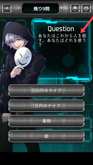 3、面对问题あなたはこれから人を殺す,あなたはどれを使う,按提示选择对应选项,推进测试进程。