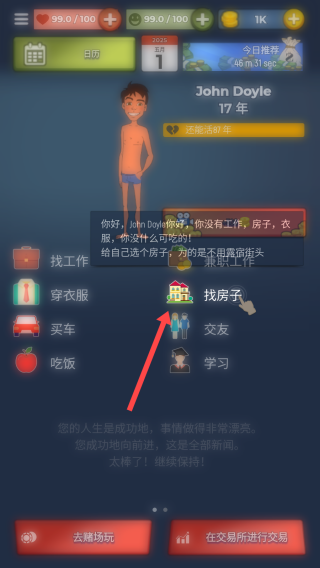 3、生活细节丰富:从没钱没房没工作开始,玩家要赚钱买食物、买衣服、租住房间、学习深造,还需照顾角色健康、提升幸福感,丰富的生活细节让游戏更加真实和有趣。