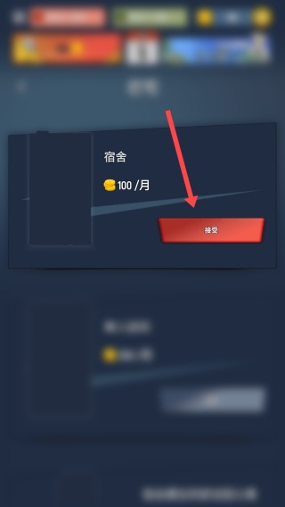 2、看到【宿舍】选项及价格为100/月后,点击【接受】按钮,支付费用确定入住宿舍,保障角色有安身之处。