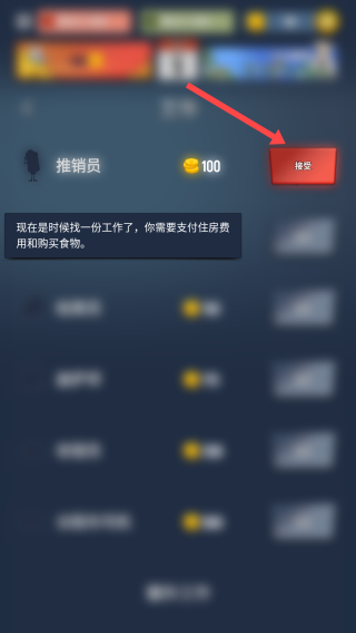 3、角色需要工作维持生计,看到【推销员】工作及对应报酬后,点击【接受】按钮,让角色获得工作赚取收入。