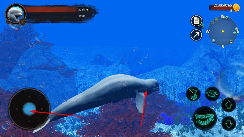 1、滑动屏幕控制白鲸游动方向与速度,点击屏幕释放特殊技能,在海底自由探索寻找食物与能量补给。