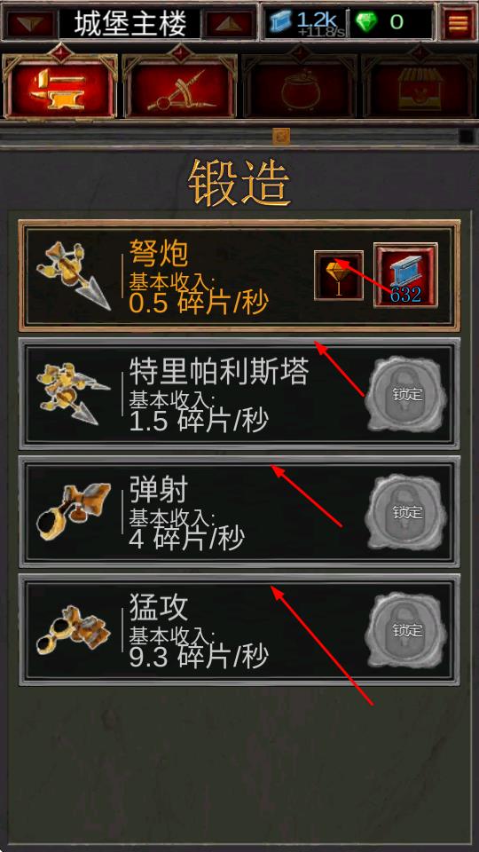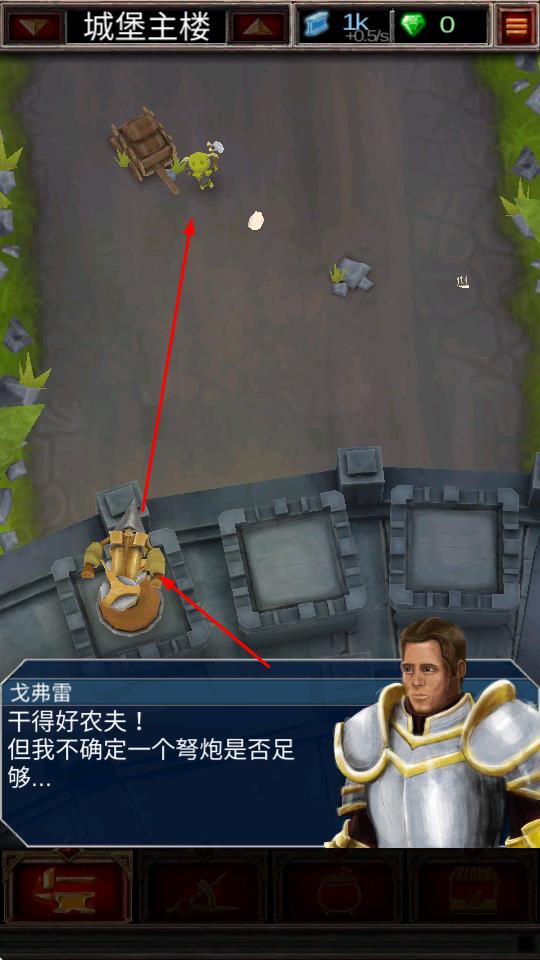1、玩家在城堡主楼场景中布置弩炮等武器,抵御如绿色怪物等敌人的进攻,保护城堡。