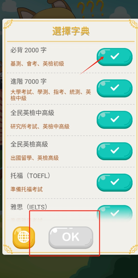 1、在选择字典界面,按需勾选词汇书,点击OK确认,确定学习范围。