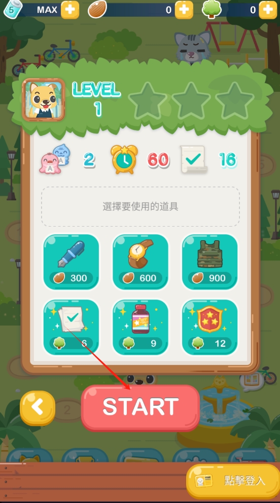 3、在关卡准备界面,按需选择道具,点击START按钮,正式开始关卡学习。