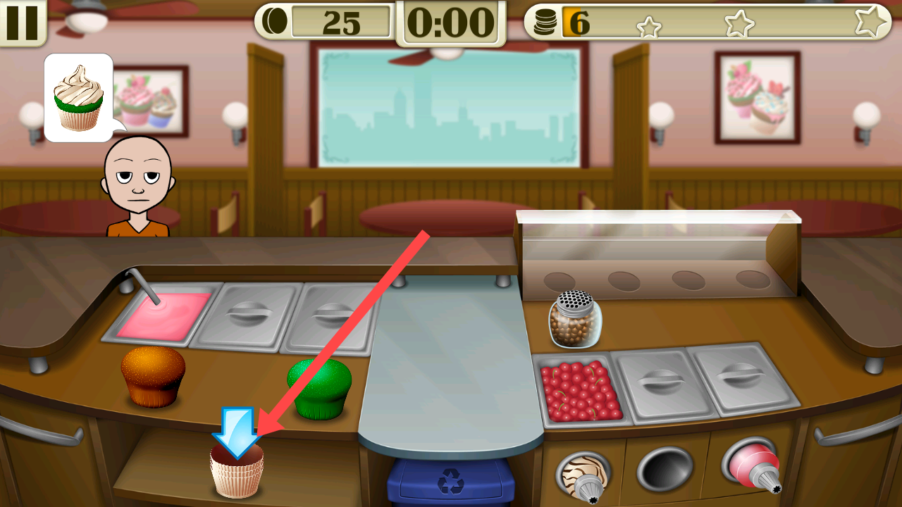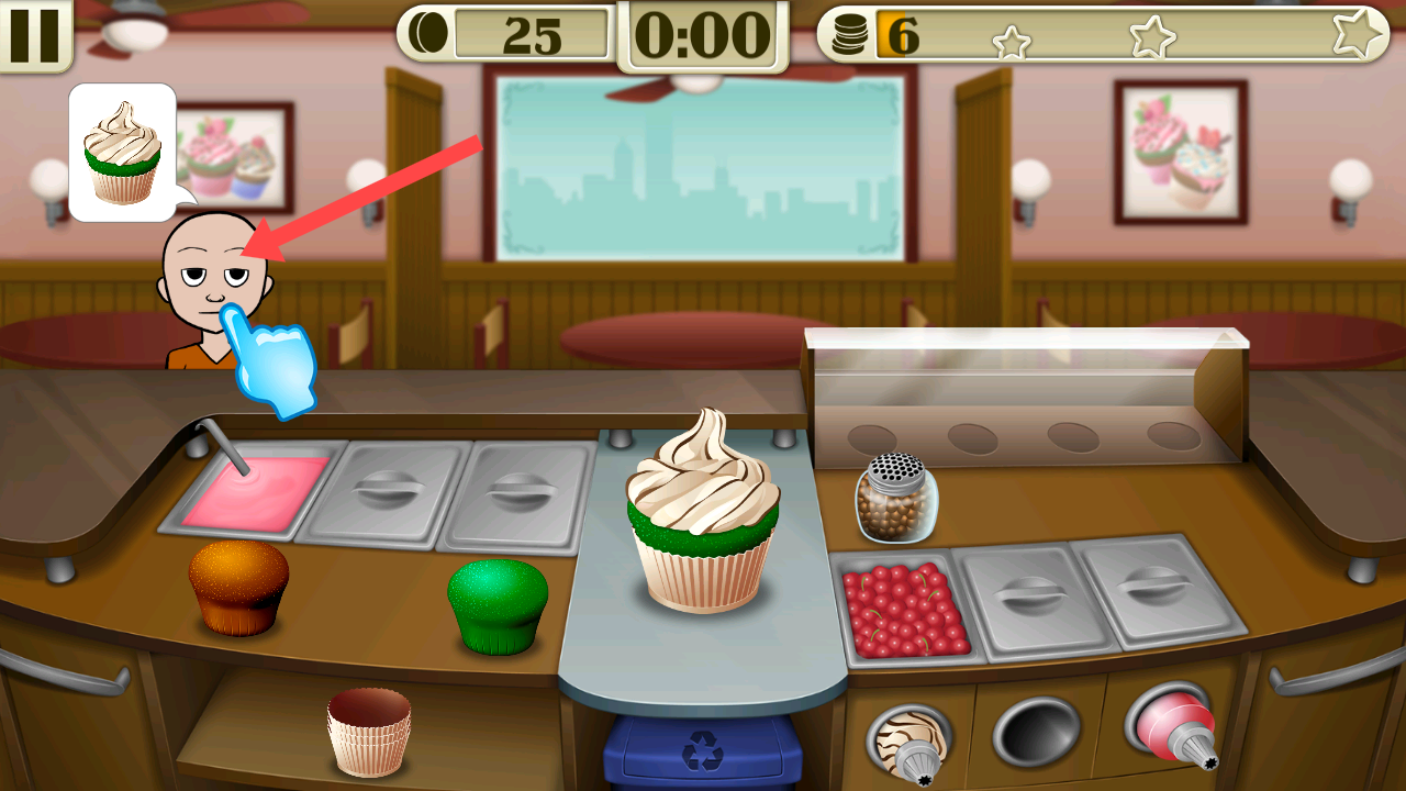 2、在游戏操作界面中,按照箭头提示将对应食材如纸杯蛋糕进行操作,完成蛋糕制作的前期步骤。