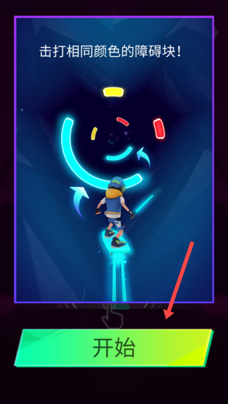 1、在游戏准备界面,看到提示“击打相同颜色的障碍块!”后,点击【开始】按钮,进入游戏挑战环节。