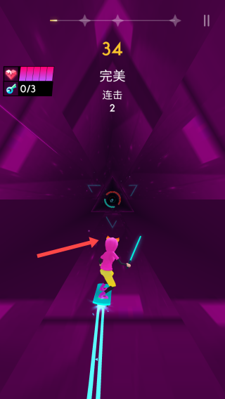 2、游戏进行中操控角色按红色箭头指示方向移动,准确击打对应颜色障碍块,获取“完美连击”提升分数。