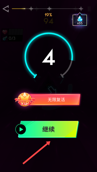 3、游戏暂停或结束界面,点击【继续】按钮,可恢复游戏进程,延续挑战并冲击更高分数。