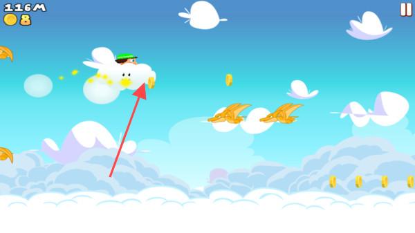 1、操控角色骑乘云朵收集空中金币,左上角实时显示行进距离与金币收集数量,以此累积分数。