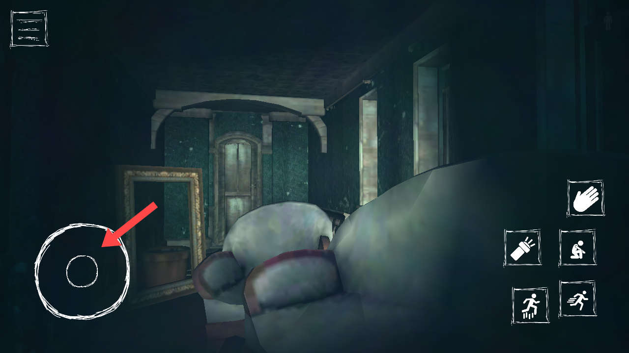 3、进入游戏场景后,通过左下角的控制摇杆如图中箭头所指来操控角色移动,配合右侧功能按钮进行探索。