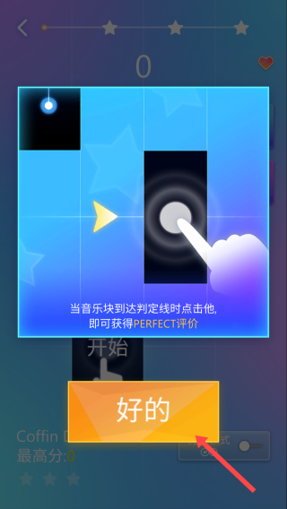 1、在游戏操作说明界面,阅读提示“当音乐块到达判定线时点击他,即可获得PERFECT评价”后,点击【好的】按钮,进入游戏。
