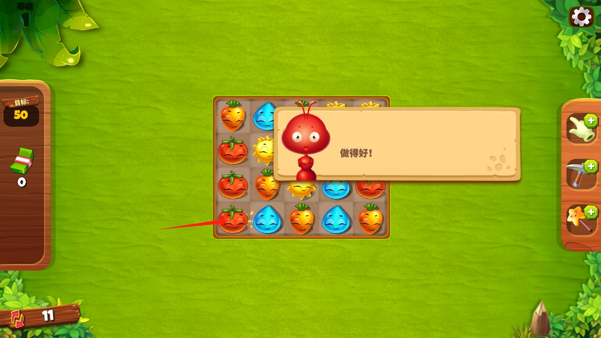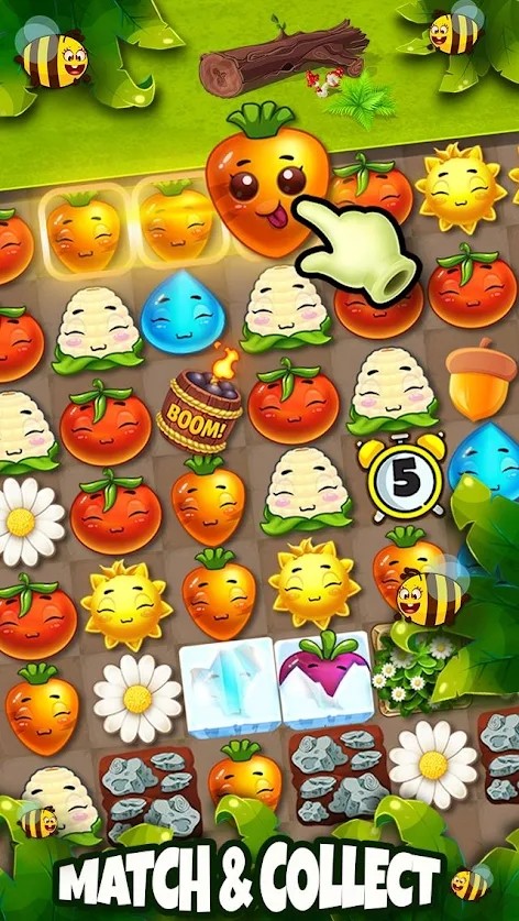 2、音效系统:轻松欢快的背景音乐与生动的音效反馈,消除元素与收集蔬菜的声音富有节奏感,增强游戏代入感与操作流畅度。
