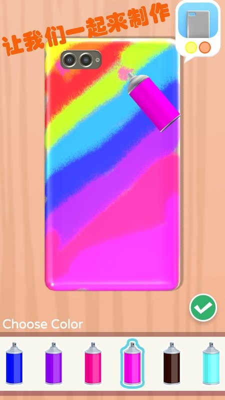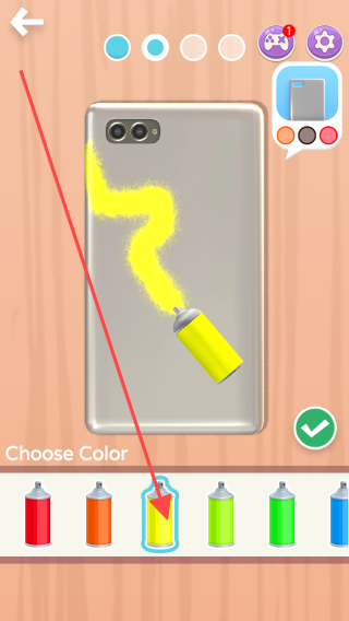 3、进行喷漆装饰时,从下方颜色选项中选择心仪颜色,如黄色,点击对手机进行喷涂,完成装饰后点击【√】确认。