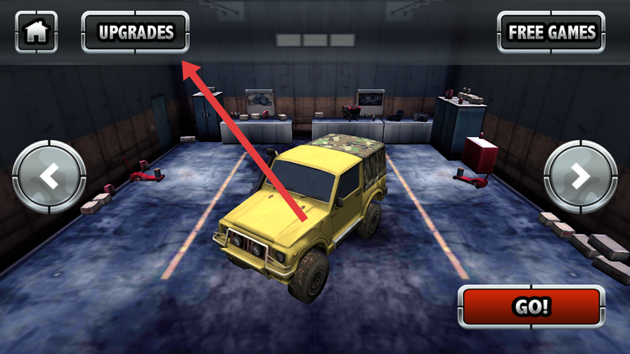 1、进入游戏后点击三角形按钮,进入主界面,点击左上角的UPGRADES改装。