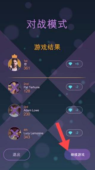 2、对战模式游戏结果界面,点击【继续游戏】按钮,可再次参与对战模式,继续游戏挑战并获取奖励。