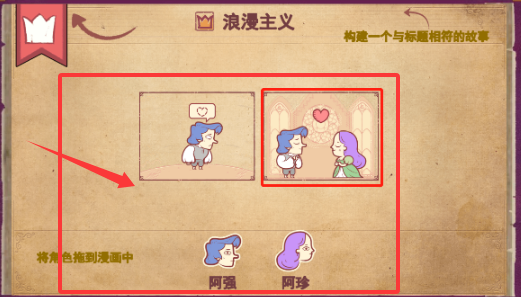 1、首先把阿强拖入到第一个框中,再把阿强和阿珍都拖入到第二个婚礼殿堂的框中,就作为对方的初恋相爱结婚。