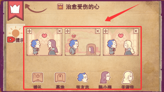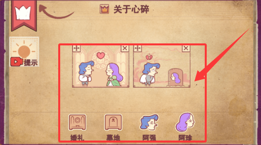 2、把阿强和阿珍拖入到左边框中结婚,之后把墓地拖入到右边框中,再将阿强拖入到右边框的坟地旁,把阿珍拖入坟地里,便通关成功。