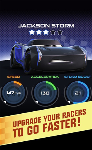 1、经典角色齐聚:收录闪电麦坤、法兰斯高等20个电影角色,每辆赛车个性鲜明,支持升级性能与定制喷漆,打造独一无二的专属座驾。