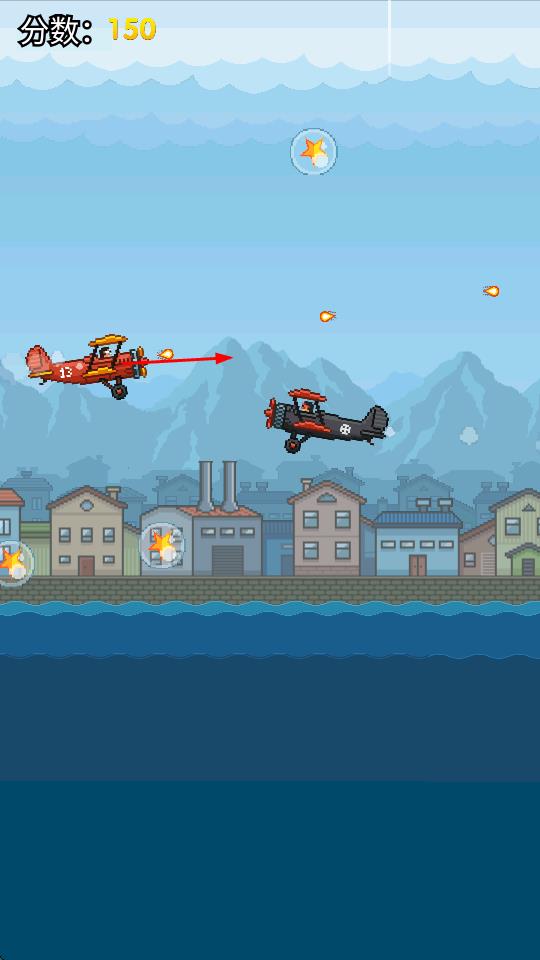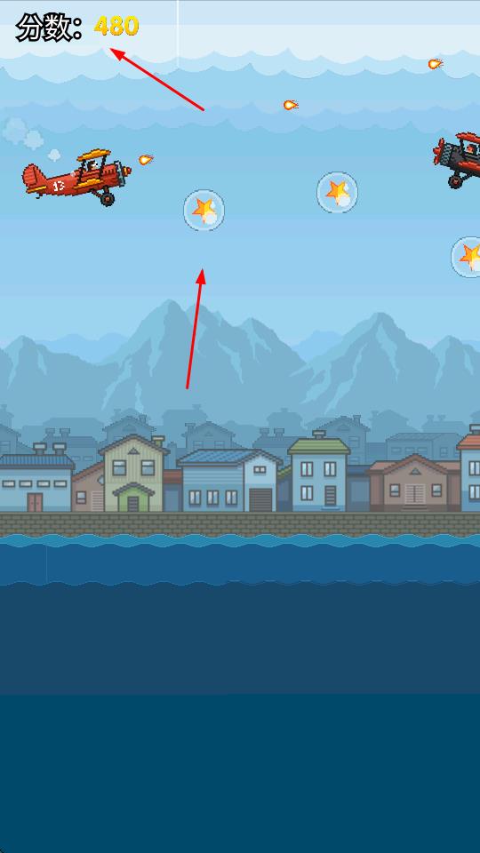 3、游戏中设有星星等道具,玩家操控飞机收集道具可获得分数,分数实时显示。