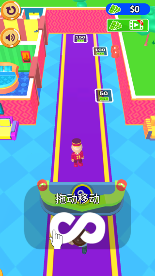 1、画面底部有【拖动移动】的操作提示,中间是一条紫色道路,玩家通过拖动角色在道路上移动,具有轻松娱乐的特点。