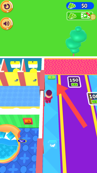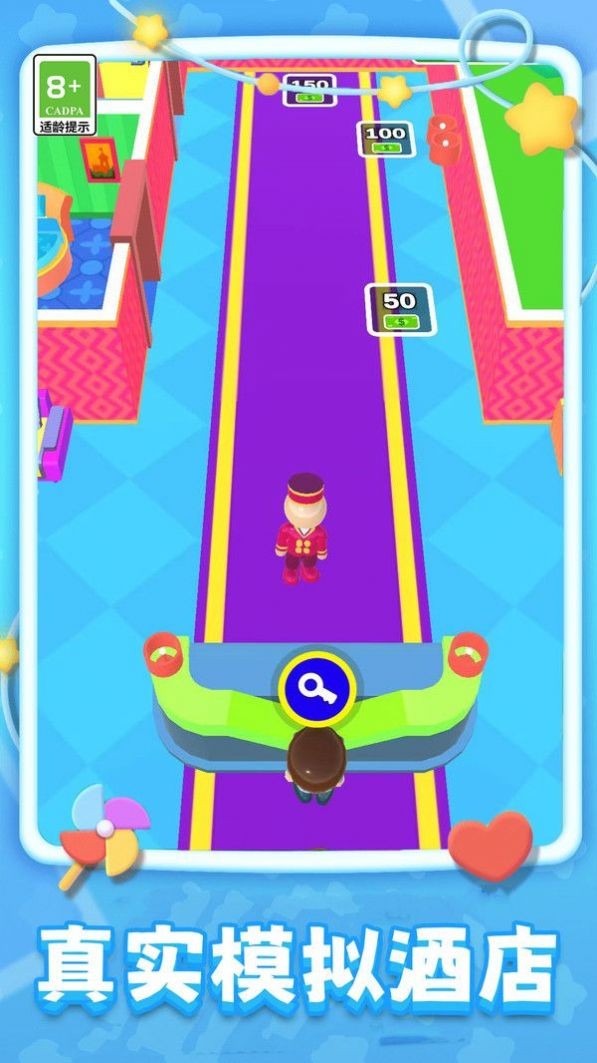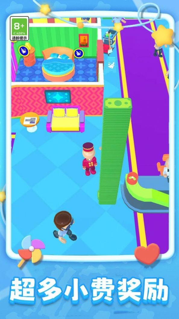 3、根据退房的顾客,玩家需操控角色在道路上进行移动,收集相应物品或数值,具有轻松娱乐的特点。