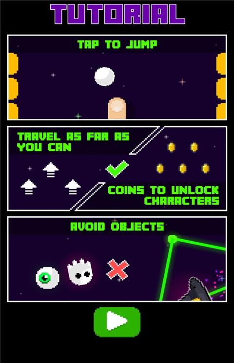3、尽可能地让角色前进,途中收集金币,这些金币可用于【CHARACTERS】解锁角色。