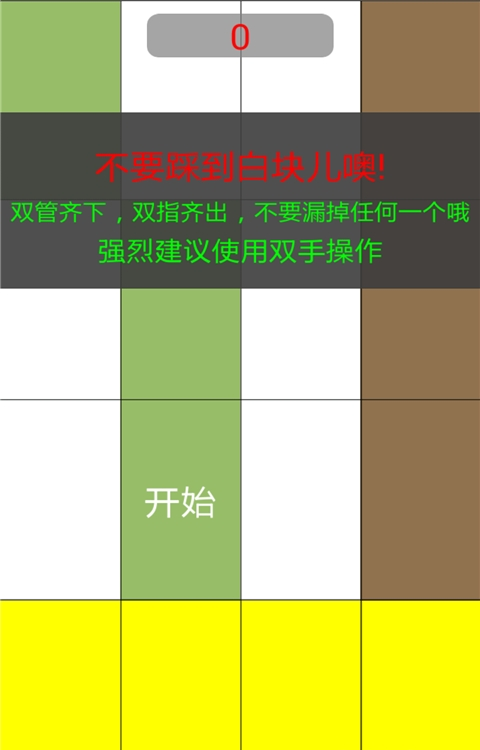 2、依据【不要踩到白块儿噢!】和双管齐下点击【开始】,用双手操作,避免踩到白块。