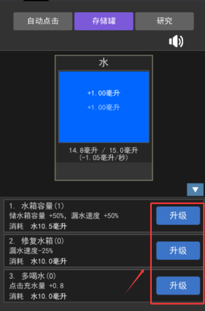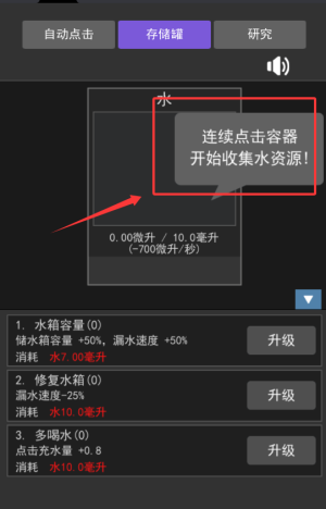 1、基础取水操作,点击收集水滴,升级容器扩大储水容量。