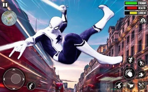 1、通过虚拟摇杆与按键组合实现攀爬、飞跃、攻击等动作,灵活运用蛛丝穿梭于高楼之间。