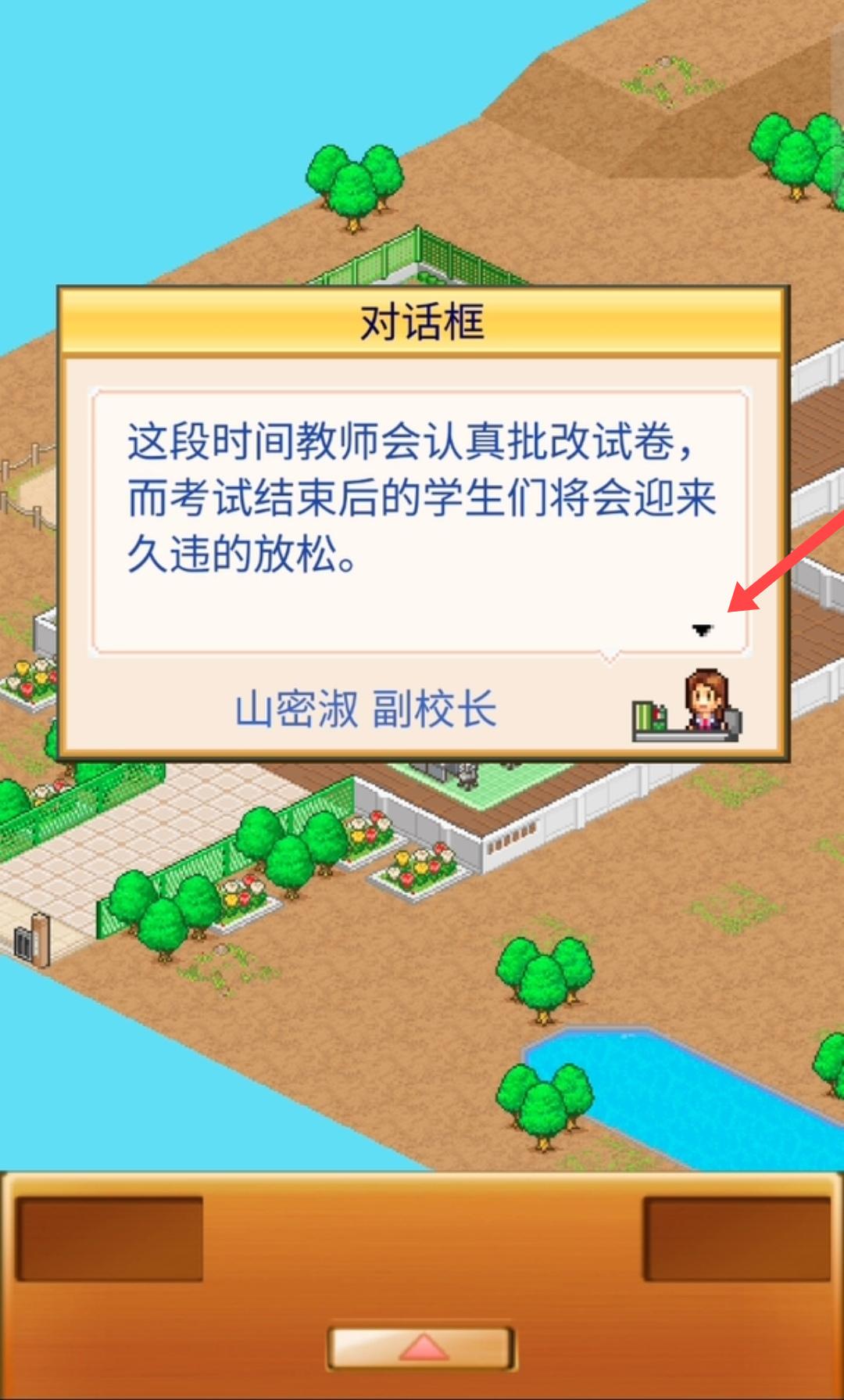3、与副校长对话,出现对话框时,点击对话框下方箭头指示处,继续推进游戏剧情对话。