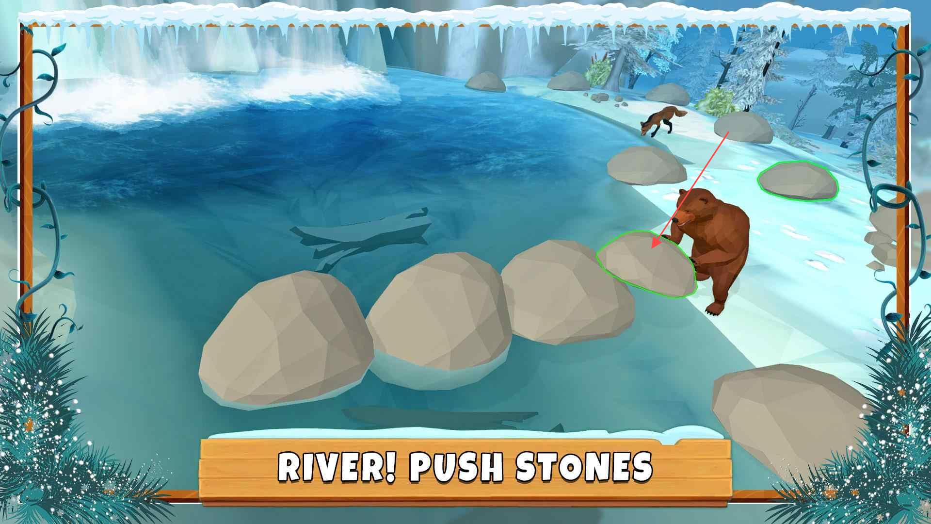 1、基础生存资源收集:操控狗熊寻找鱼类聚集的河流、驯鹿迁徙路线等食物来源,及时补充能量维持生命值,躲避暴风雪等极端天气威胁。