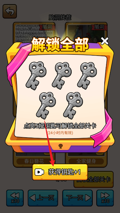 3、在【解锁全部】界面,按照提示点亮5把钥匙可解锁全部关卡,可通过点击来获取钥匙。