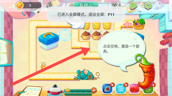3、进入关卡后,按照提示“点击空地,建造一个厨具”,在场景空地处放置厨具,开始布置厨房,抵御如老鼠等敌人。