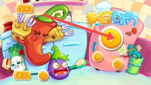 1、在游戏主界面,点击粉色冰箱上的黄色按钮,进入游戏关卡地图界面。