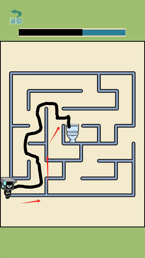 3、根据图中箭头提示,画一条穿过迷宫的线,帮助人物到达马桶。