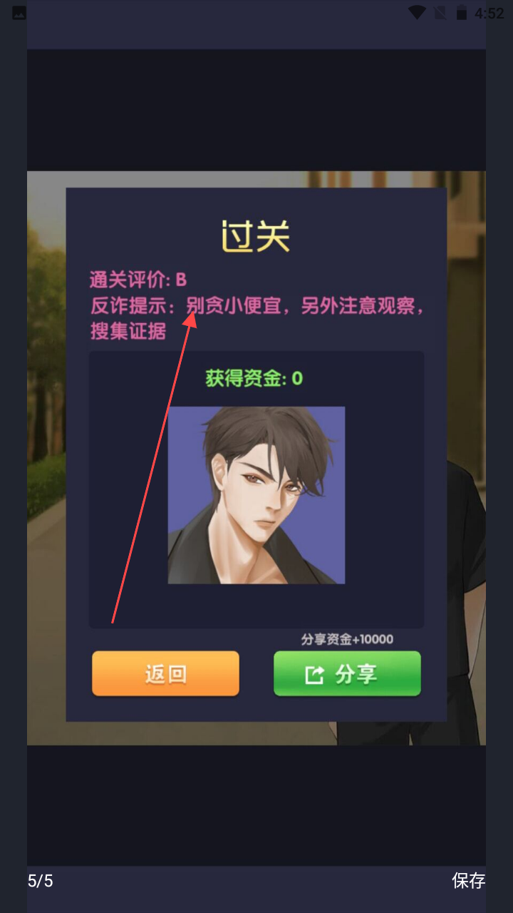 3、显示【通关评价:B】,给出【反诈提示:别贪小便宜,另外注意观察,搜集证据】,配备【返回】和【分享】按钮,展示游戏通关后的结果与相关提示。