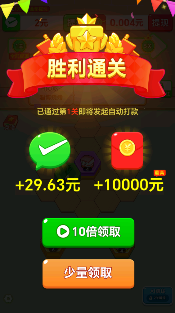 3、成功通关后,可选择【10倍领取】或【少量领取】,留意【即将发起自动打款】提示,关注收益到账情况。