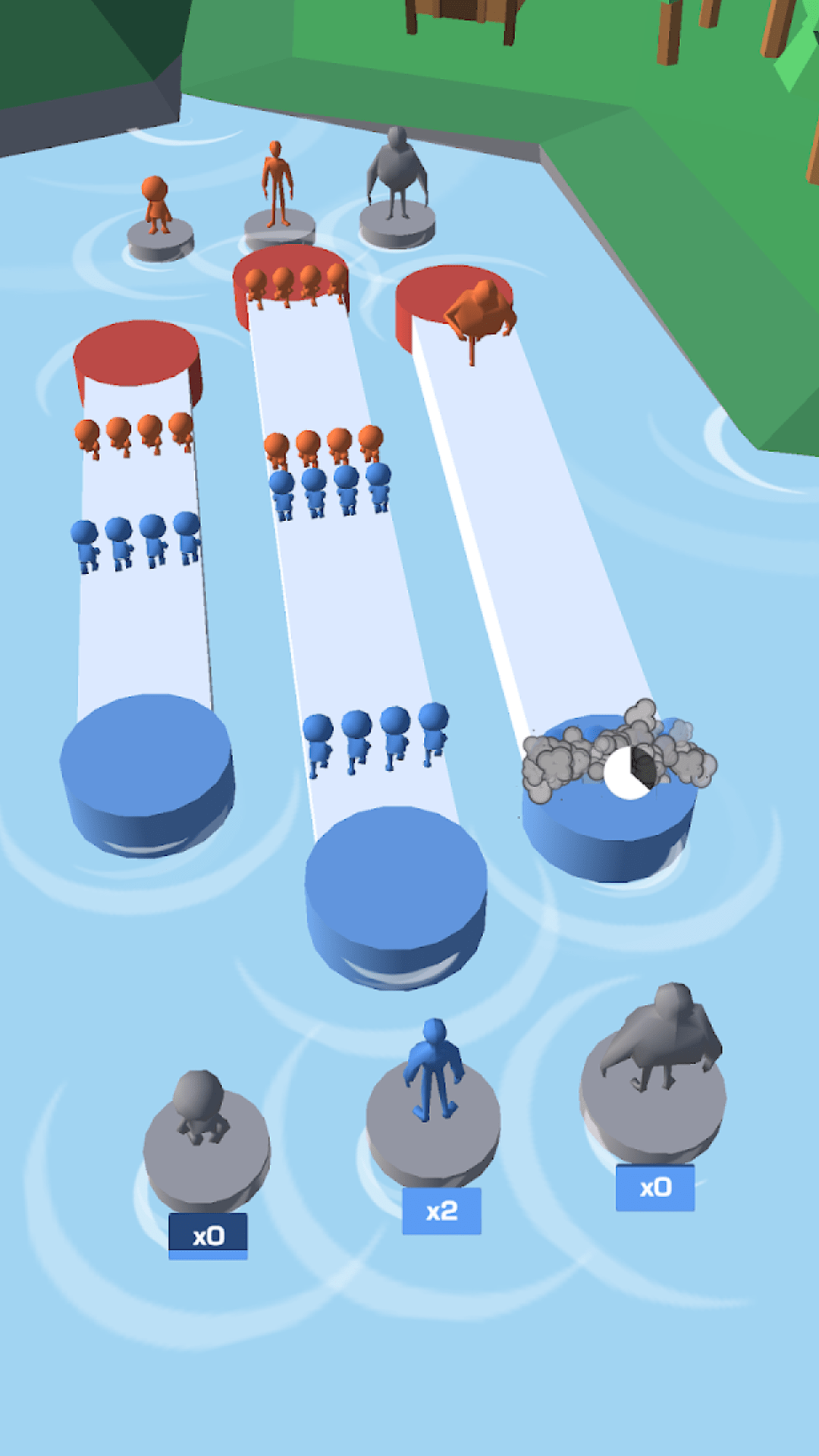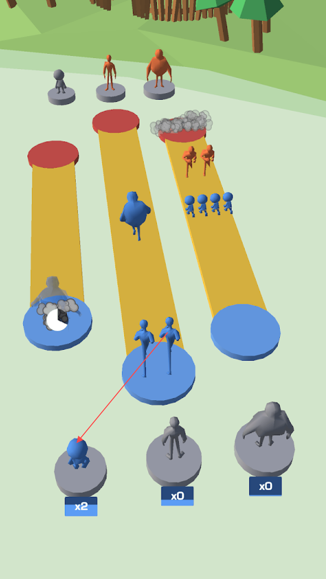3、在游戏关卡中,按箭头指示滑动小人,利用数量优势突破防线,同时留意平台数字变化,合理规划每一步操作。