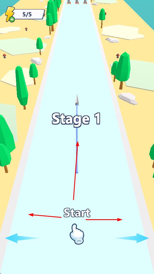 1、玩家操控箭矢在道路上前进,通过滑动屏幕等操作控制角色移动方向,躲避道路上的障碍,如红色墙体。