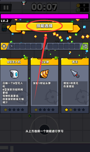 2、还有精彩的技能模式,拾取足够的材料后,可以选择技能升级。