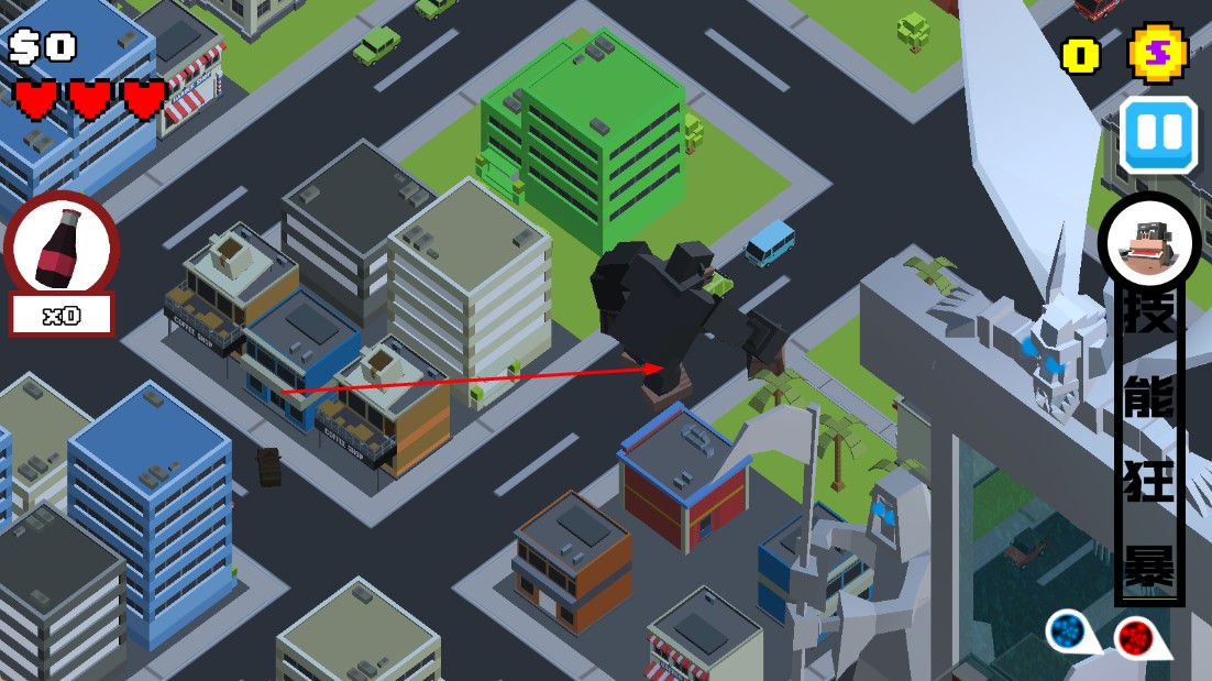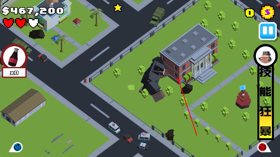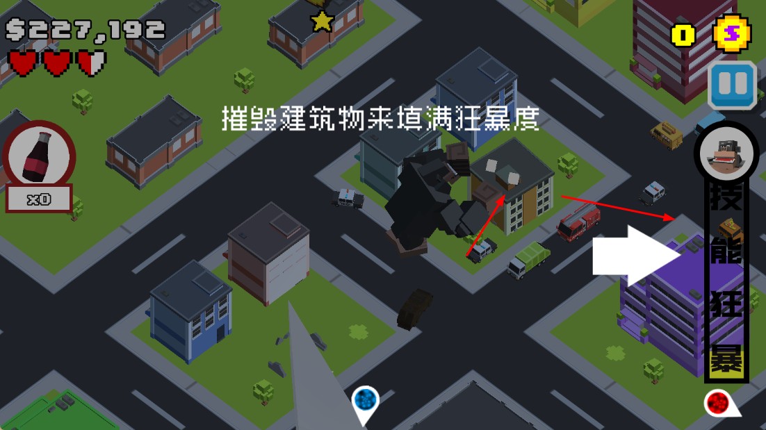 3、躲避人类军队发射的导弹、激光等攻击,通过破坏建筑获取能量,能量满格后可解锁更强大的终极技能。