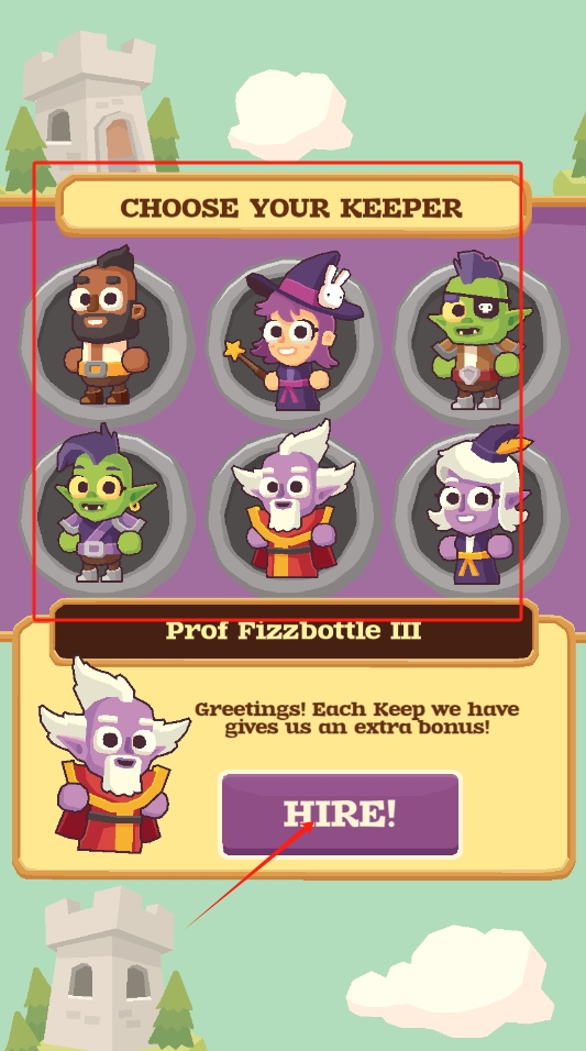 1、在角色选择界面,挑选心仪的Keeper角色,如ProfFizzbottleIII,点击HIRE雇佣。