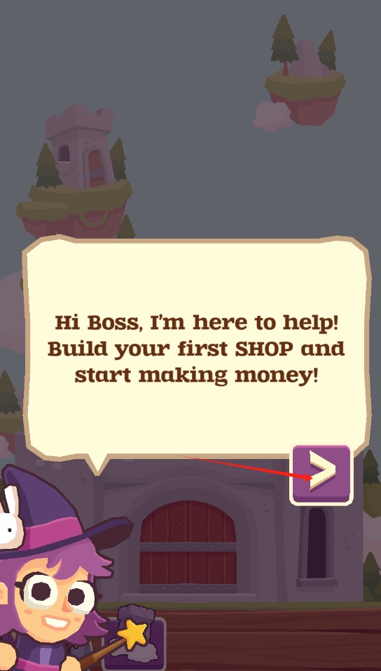 2、看到提示信息后,点击箭头按钮,按照指引开启建造首个店铺的操作。