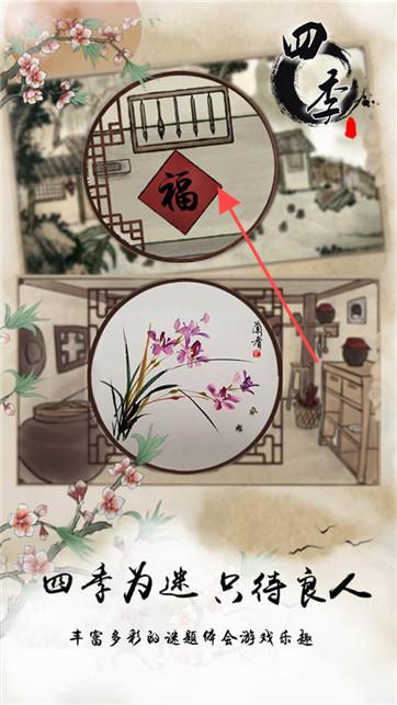 2、在游戏场景界面,若发现有“福”字、兰花绘画等元素,同时看到“四季为谜只待良人,丰富多彩的谜题体会游戏乐趣”的提示,积极参与谜题玩法。