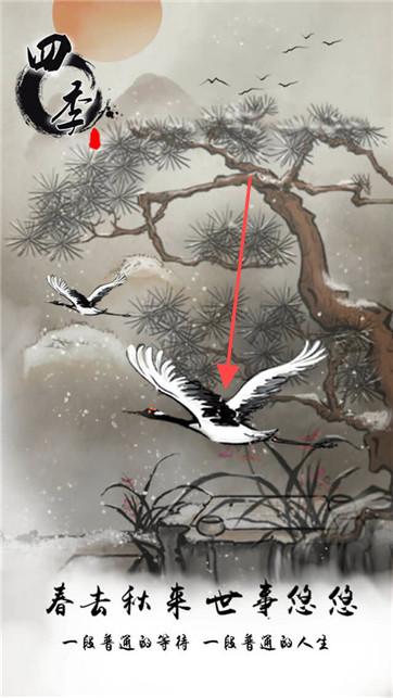 3、在游戏雪景画面中,依据松树与仙鹤的场景呈现,以及“春去秋来世事悠悠,一段普通的等待一段普通的人生”的文字描述,沉浸感受游戏的古风意境。