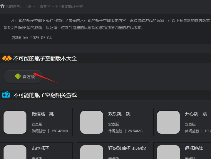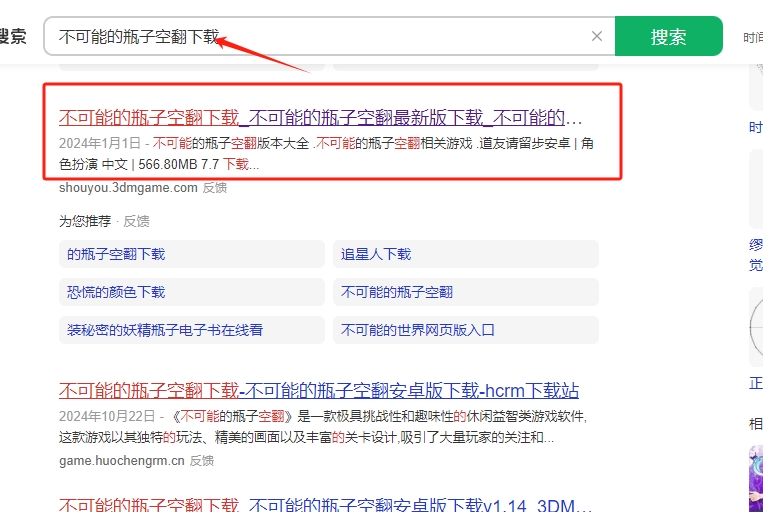 1、在网站上搜索不可能的瓶子空翻下载,并点击图片标记的链接进去下载。