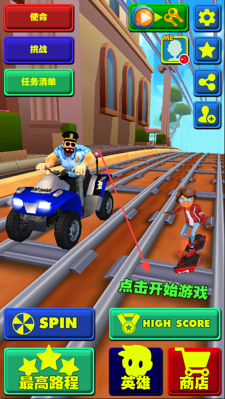 1、基础跑酷操作:通过点击屏幕完成跳跃、下滑动作,滑动切换轨道躲避迎面而来的列车、路障,长按屏幕使用滑板道具(可抵御一次碰撞)。