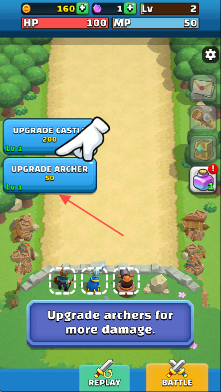 3、返回界面后点击【UPGRADE ARCHER】升级弓箭手,提升输出伤害以更好防御。