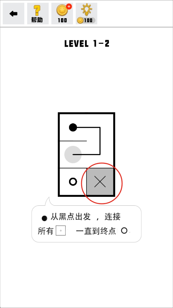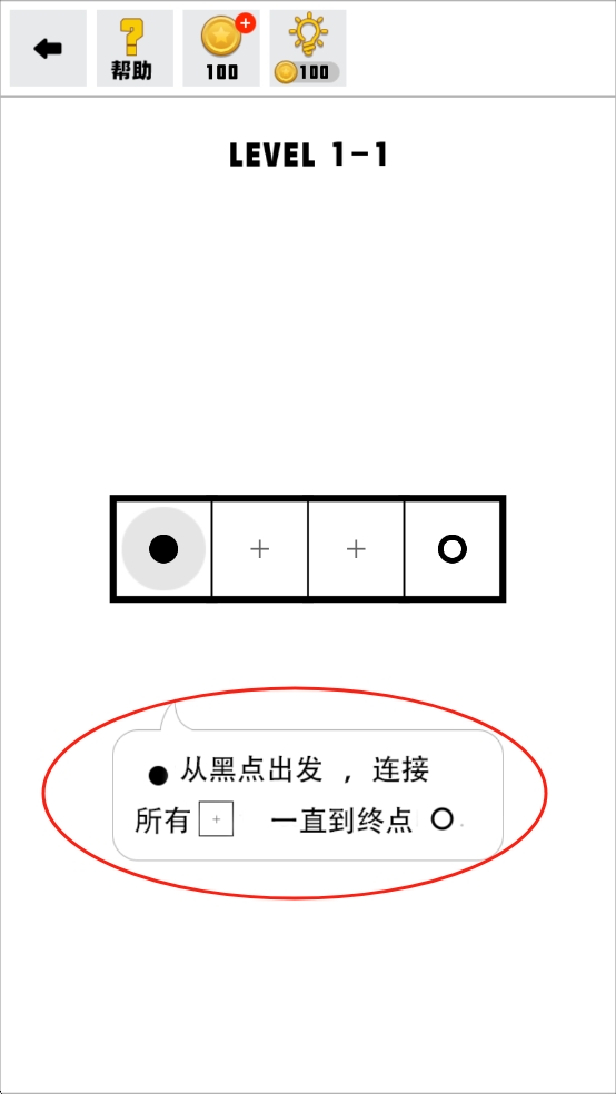 1、从黑点除,要连接所有带有加号的格子,直到到达终点白点。
