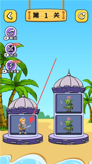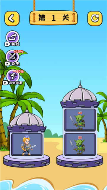 1、进入游戏第1关界面后,操控50级角色应对右侧60级与30级敌人,可点击左侧【攻击】【闪电风暴】等技能按钮提升战力,这是突破关卡的关键操作,确保战斗顺利推进。
